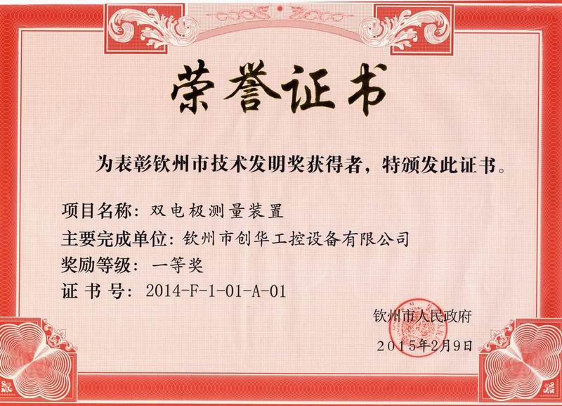 熱烈祝賀我司《雙電極測(cè)量裝置》喜獲2014年度欽州市技術(shù)發(fā)明一等獎(jiǎng)